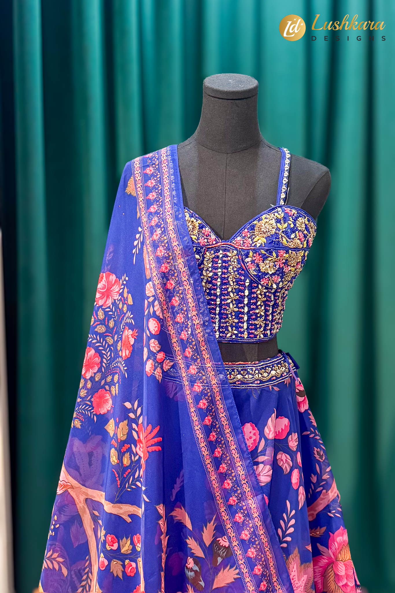 Fabric: Lightweight organza/net blend lehenga with structured corset blouse