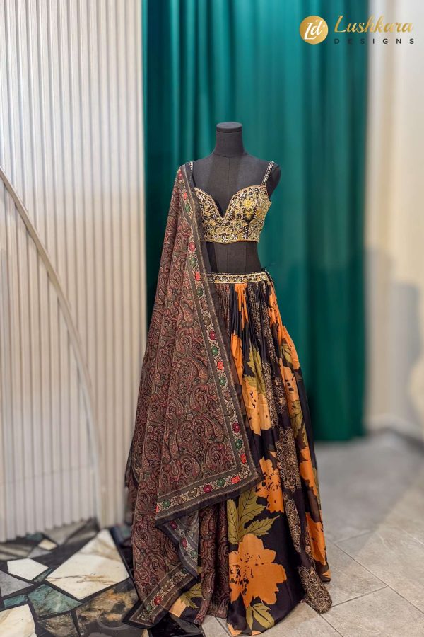 Black & Orange Floral Printed Lehenga with Paisley Dupatta