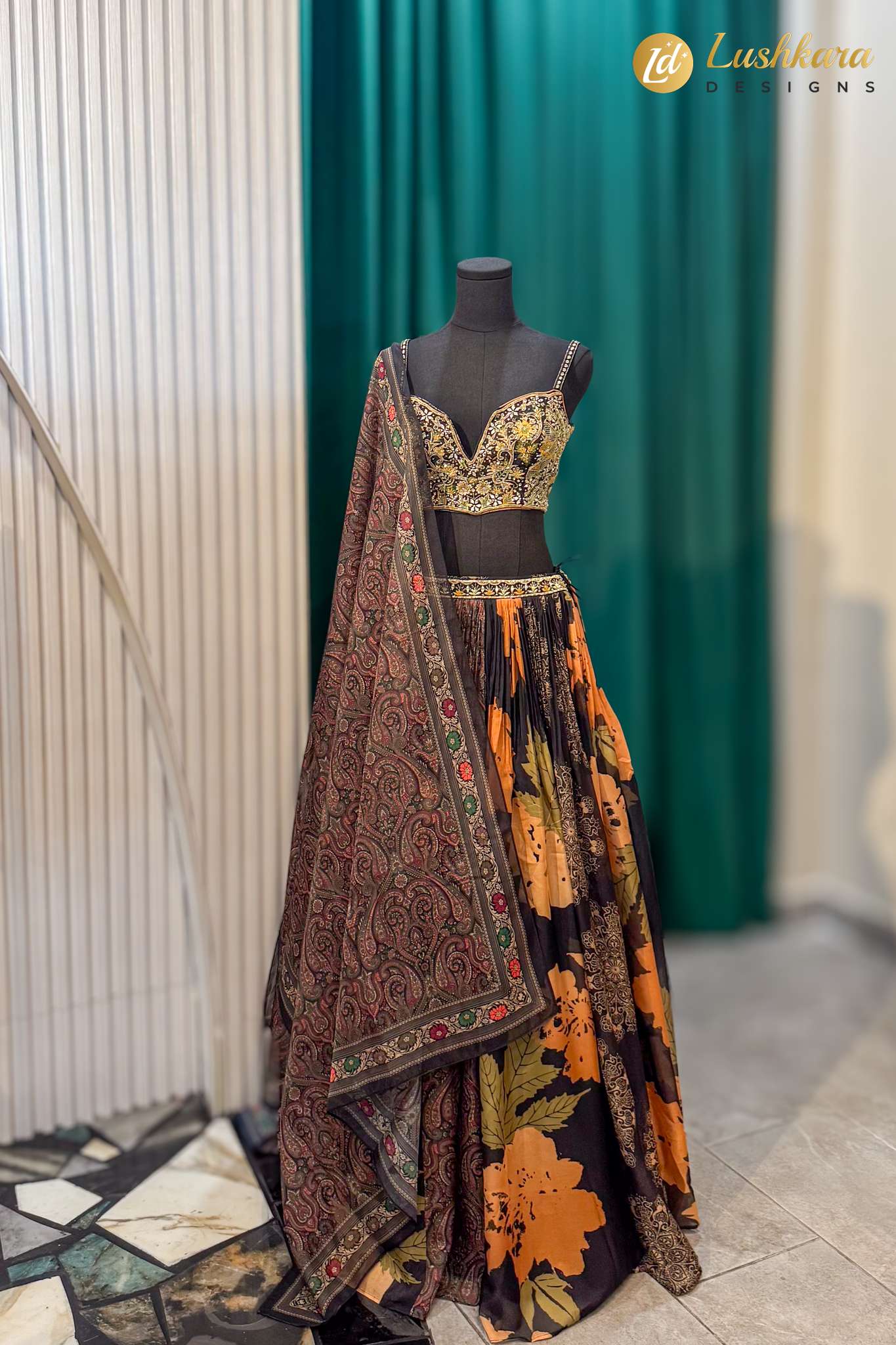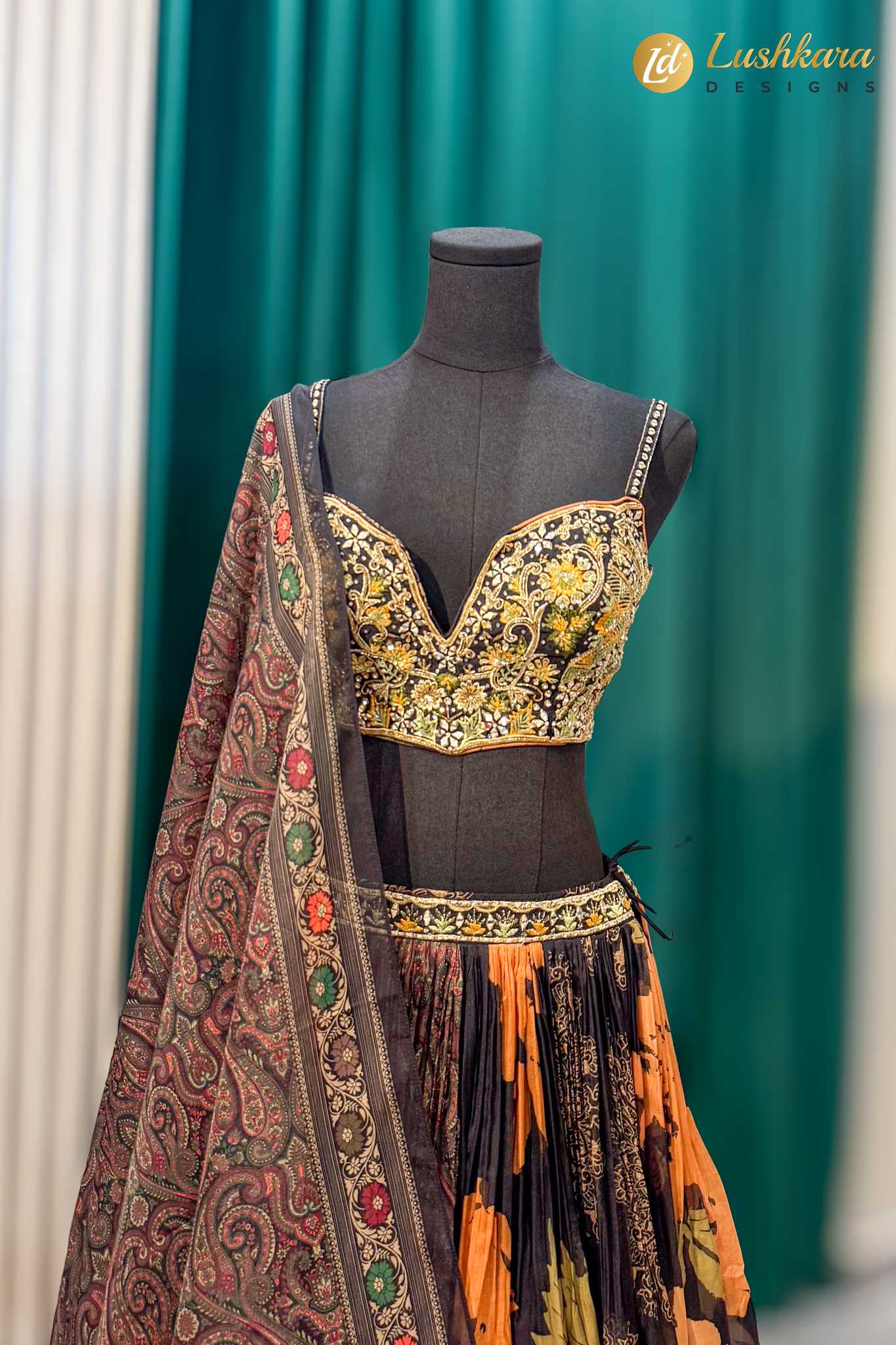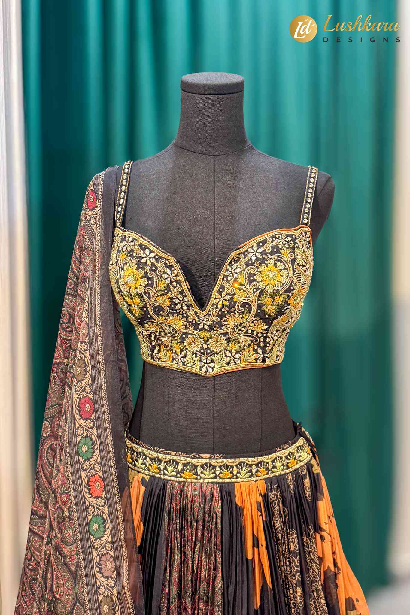 Stunning black and orange floral lehenga with heavily embroidered blouse and rich paisley dupatta. Perfect for weddings and festive occasions.