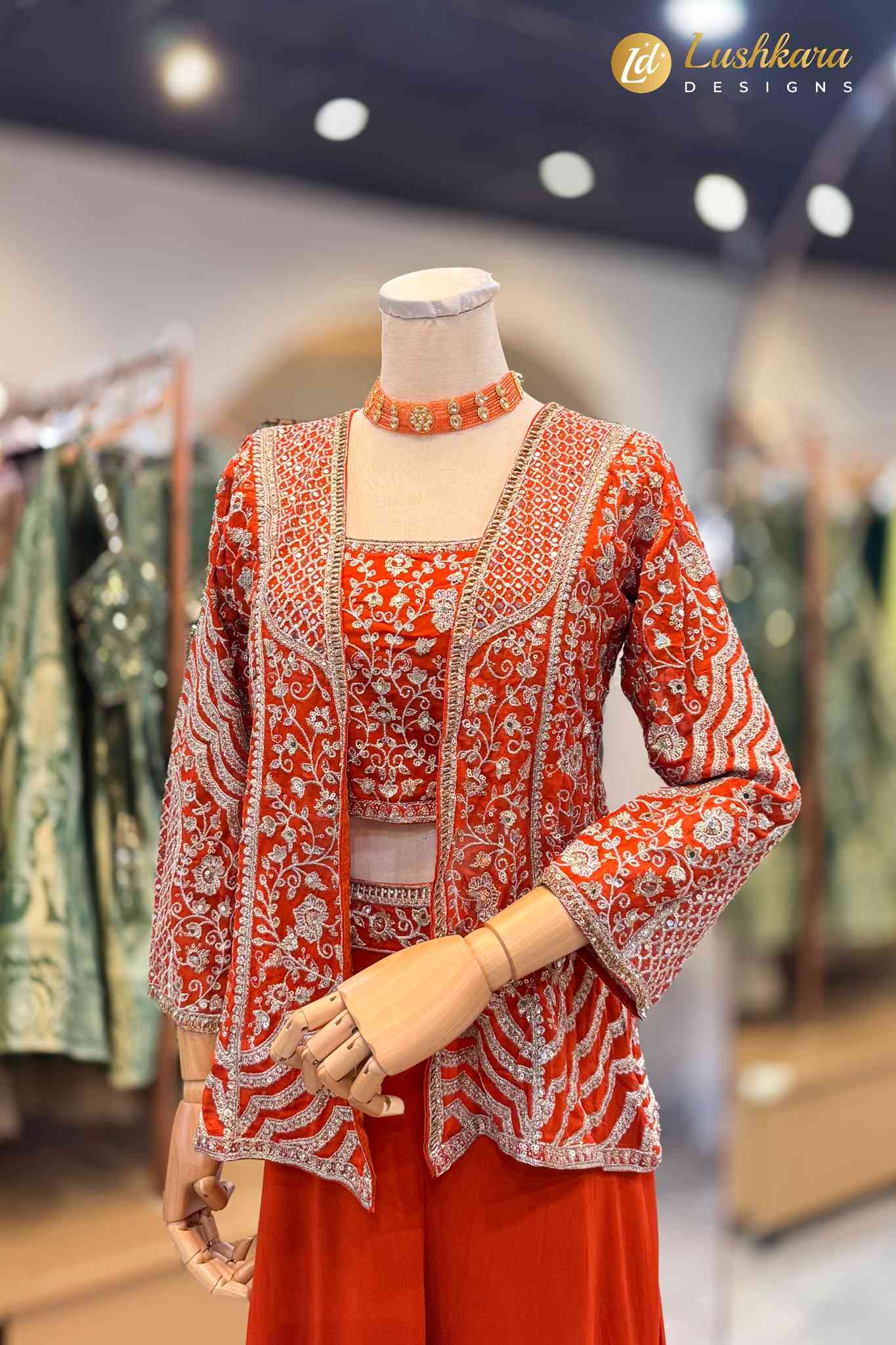 Lushkara Burnt Orange Embroidered Indo Western, Perfect for receptions, cocktail parties, and modern festive occasions.