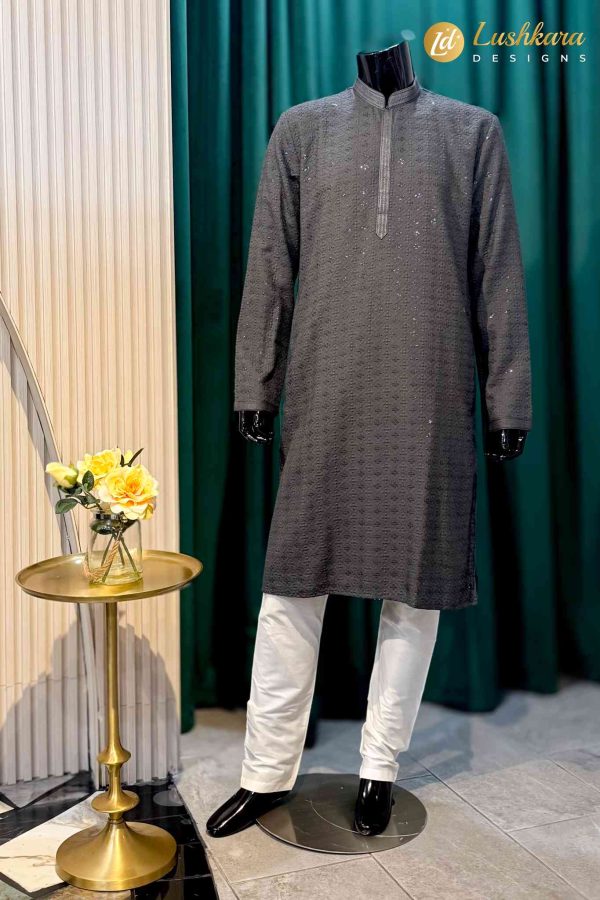 Lushkara Charcoal Grey Embroidered Mens Kurta Set