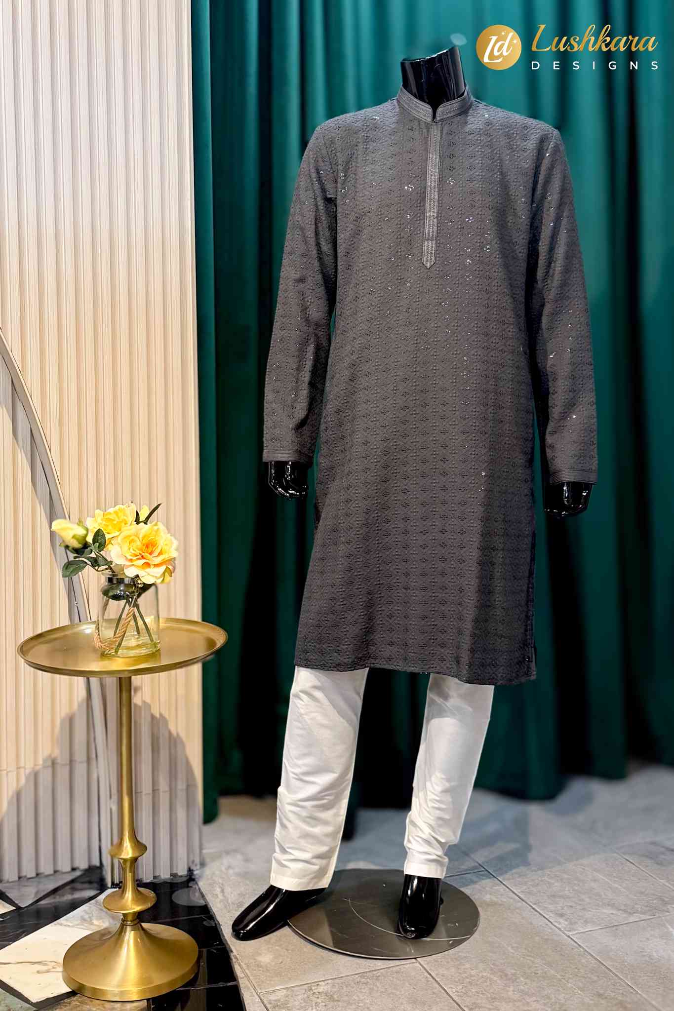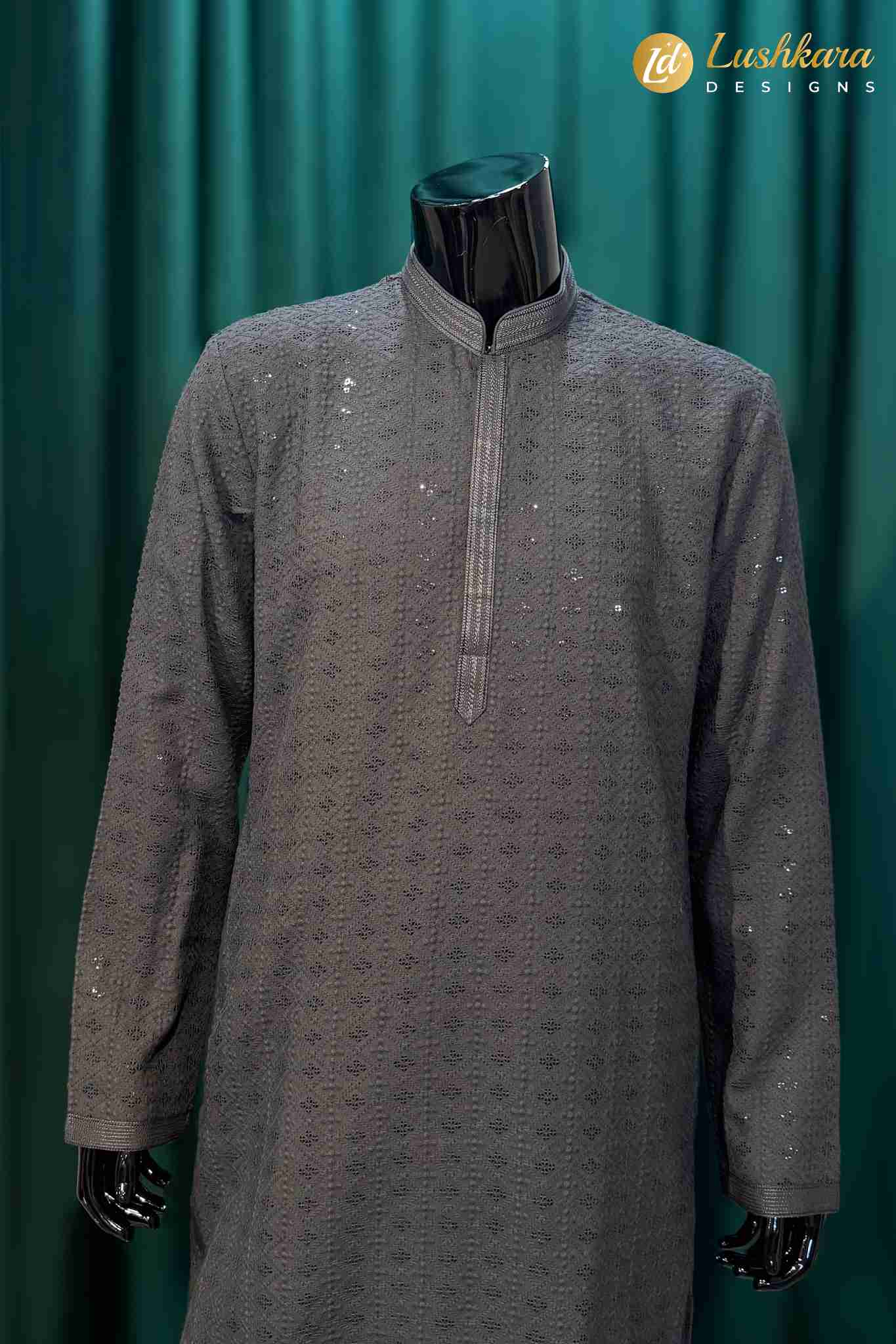 Color: Charcoal grey with tonal embroidery accents