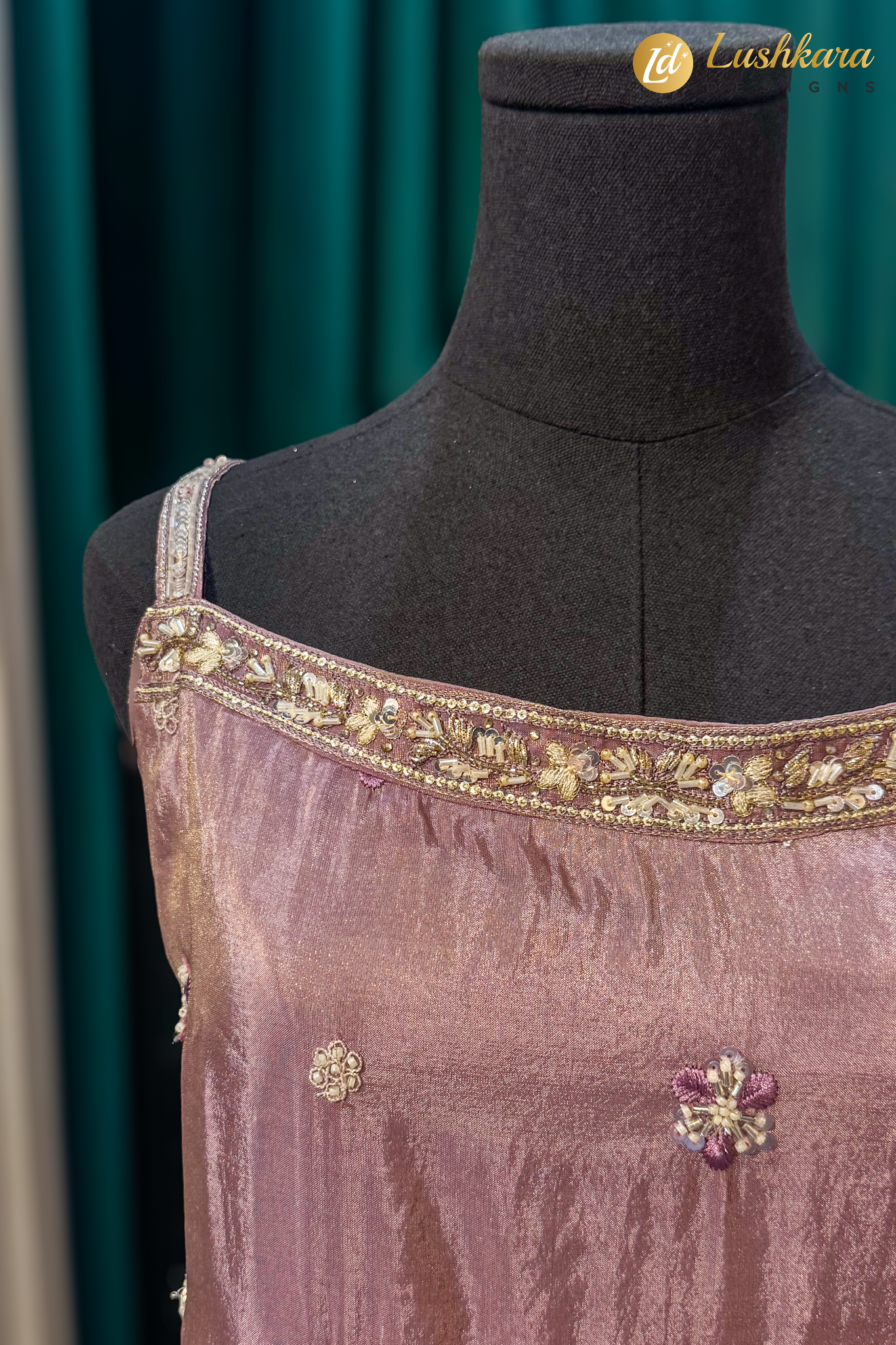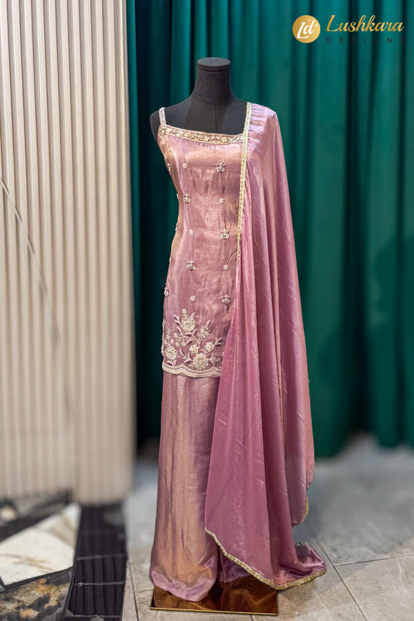 Color: Dusty rose pink with soft sheen and gold accents Fabric: Silk-blend kurta and sharara with lightweight matching dupatta Work: Subtle floral embroidery with zari and thread detailing on neckline and hem Kurta: Straight-cut sleeveless kurta with delicate embroidered motifs and border Bottom: Flowy sharara with smooth finish and elegant drape Dupatta: Matching dupatta with minimal embroidery and fine border edging Occasion: Festive wear, wedding functions, sangeet, reception, evening parties