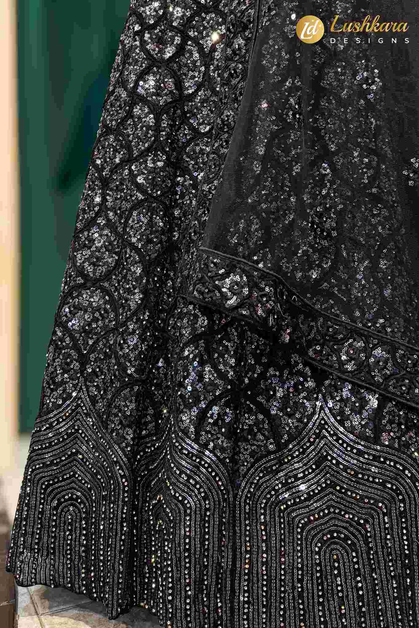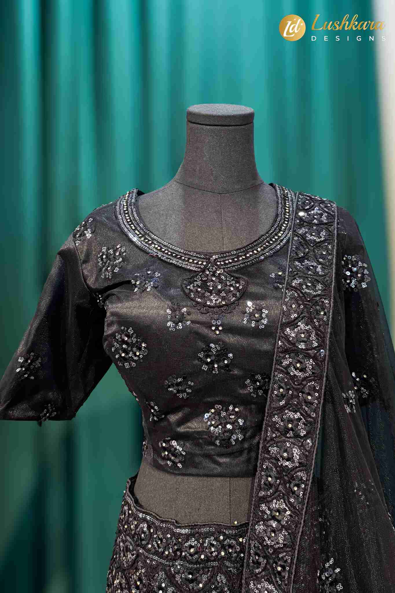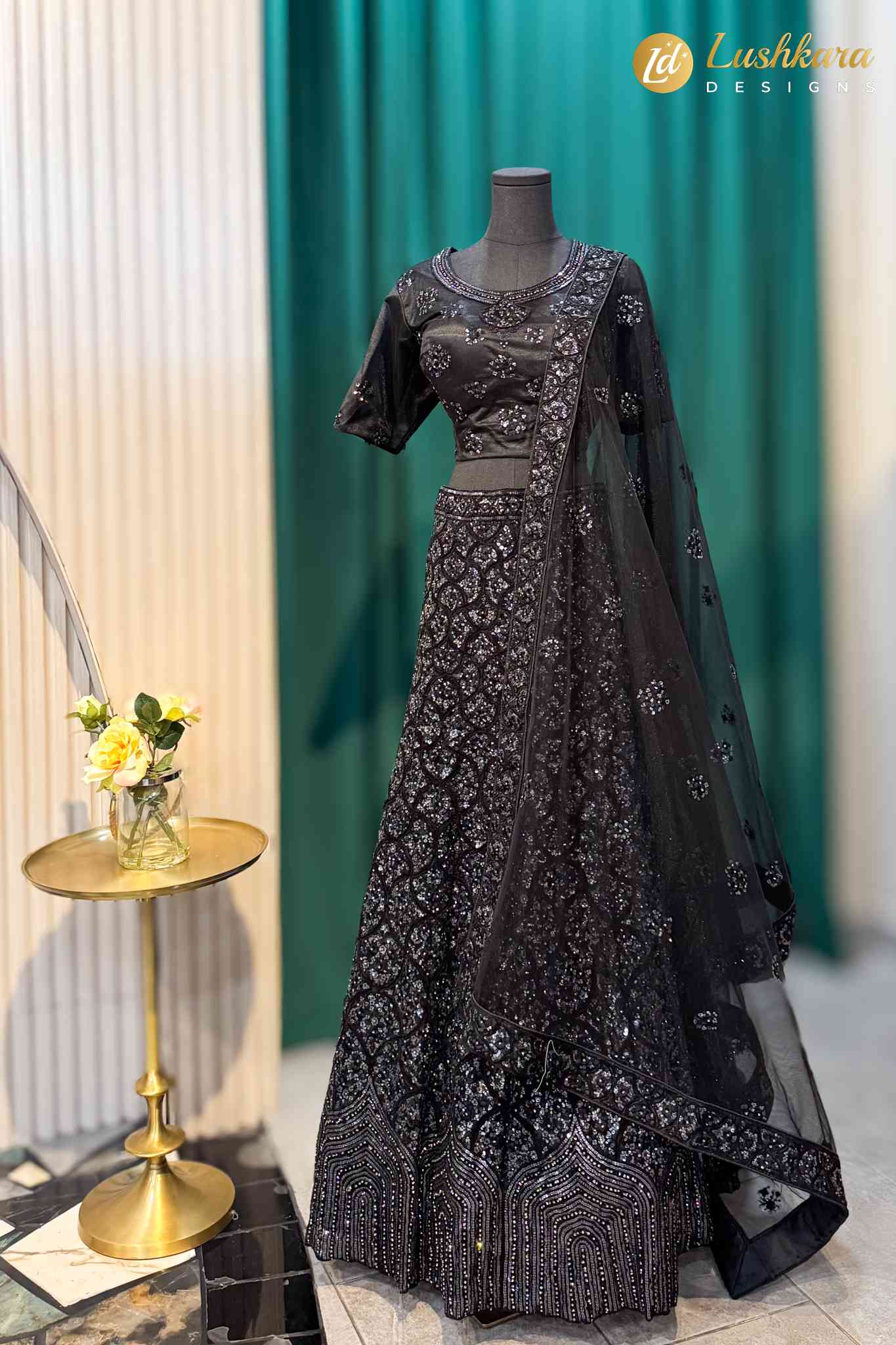 Embroidered designer lehenga featuring intricate thread and sequin work, and a soft net dupatta. Perfect for festive and special occasions.