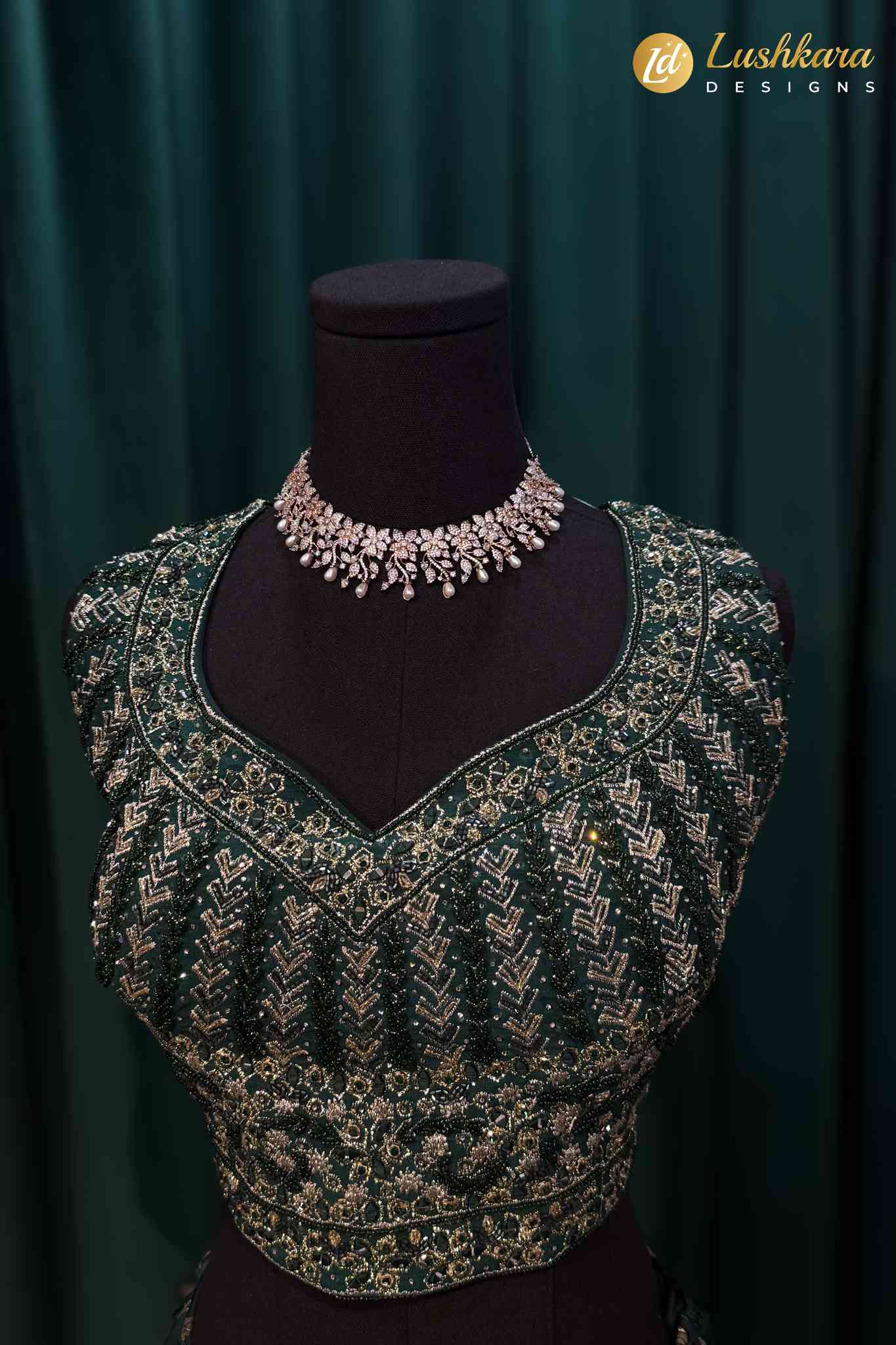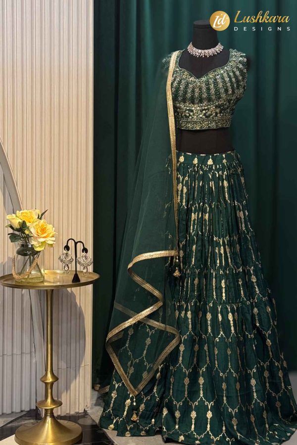 Lushkara Emerald Green Embroidered Lehenga Set. Perfect for festive celebrations such as wedding, party, and cultural occasions.