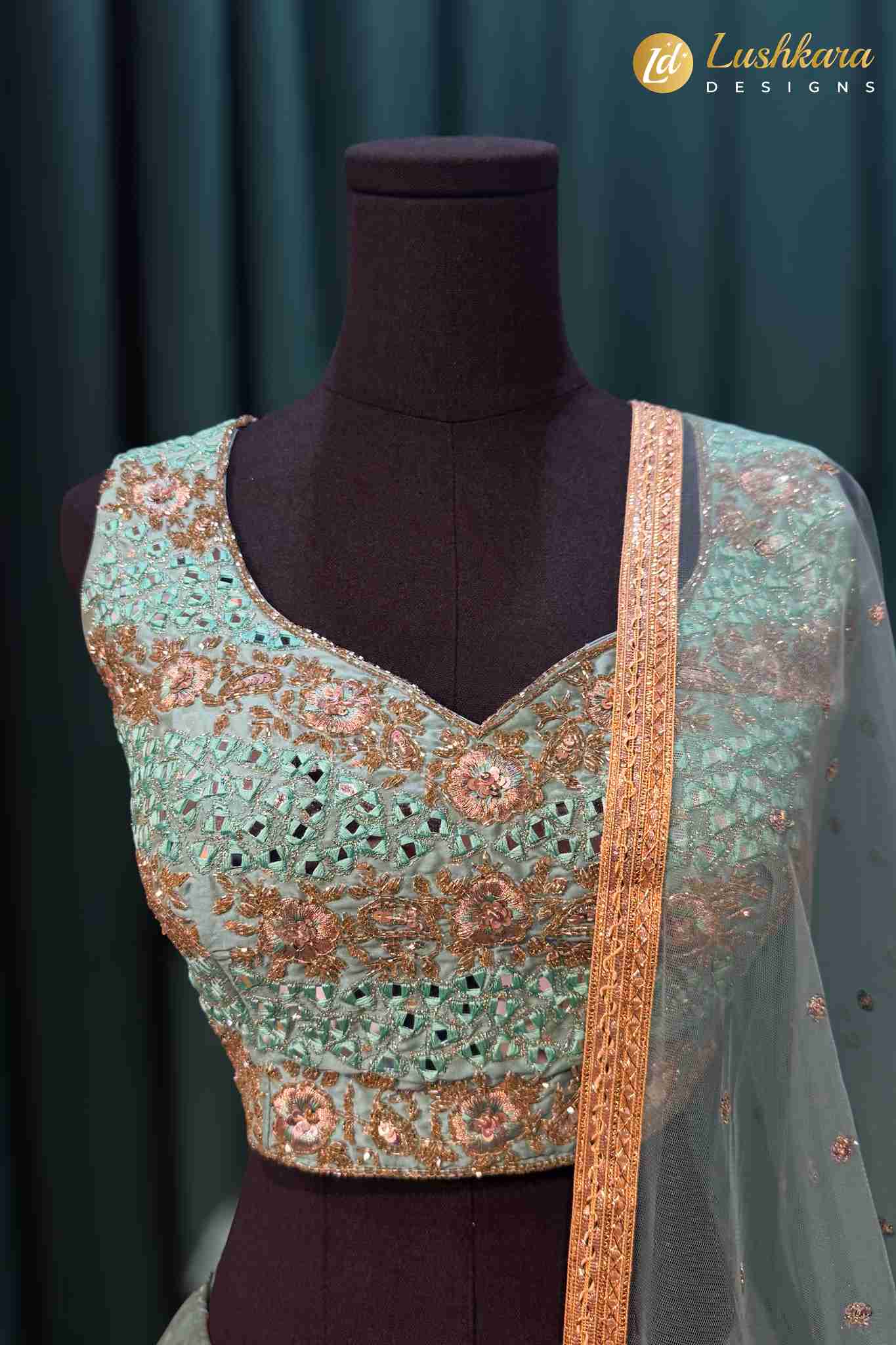 • Lehenga: Flowy lehenga skirt with delicate sequin motifs