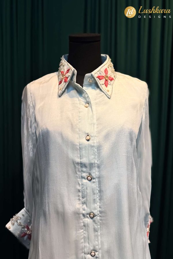 Work: Hand-embroidered collar & cuffs with pearl and floral detailing