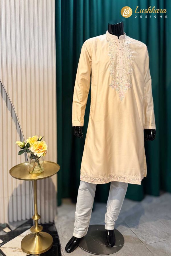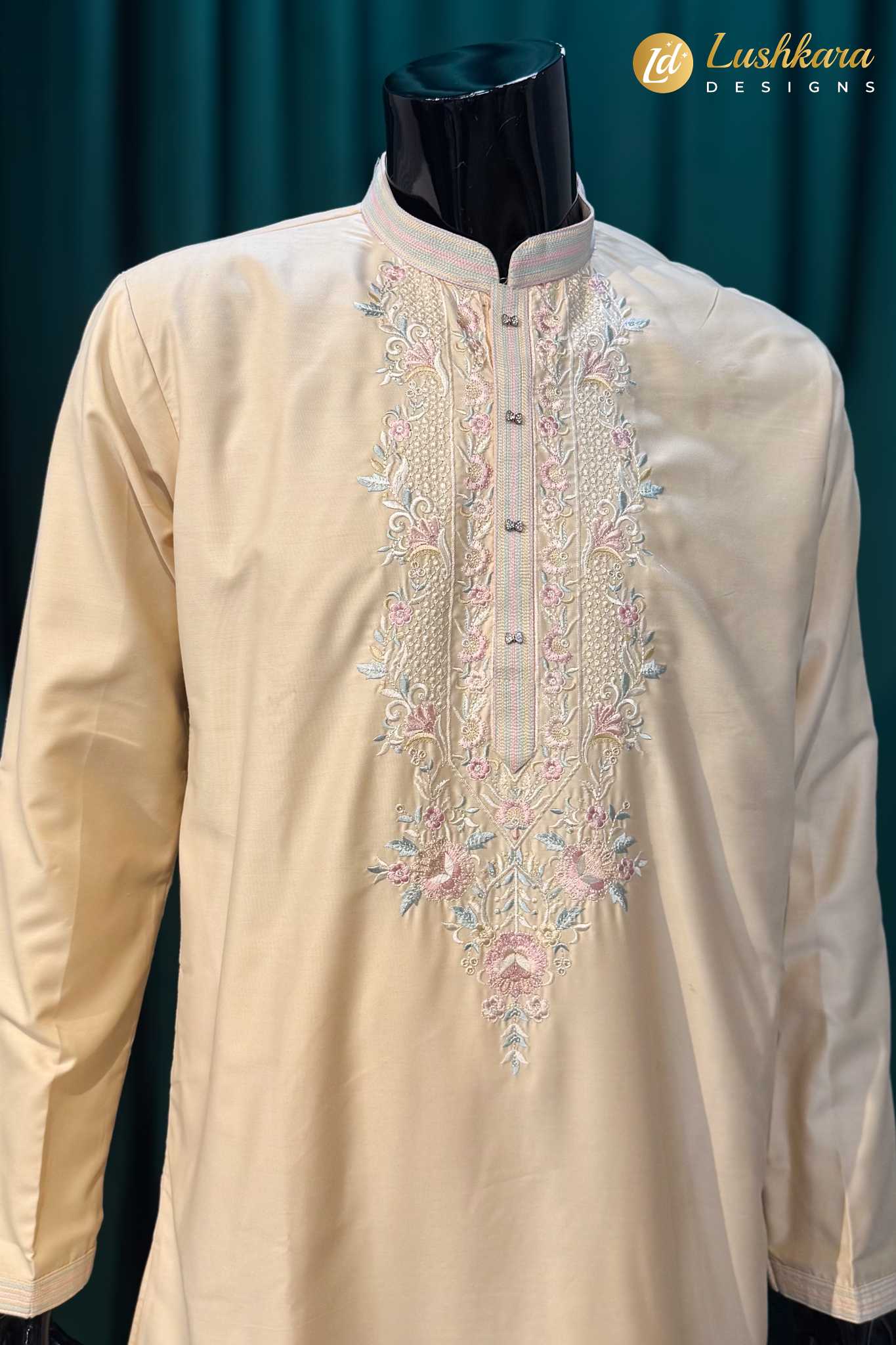 Work: Intricate thread embroidery on the front placket with coordinated hem detailing