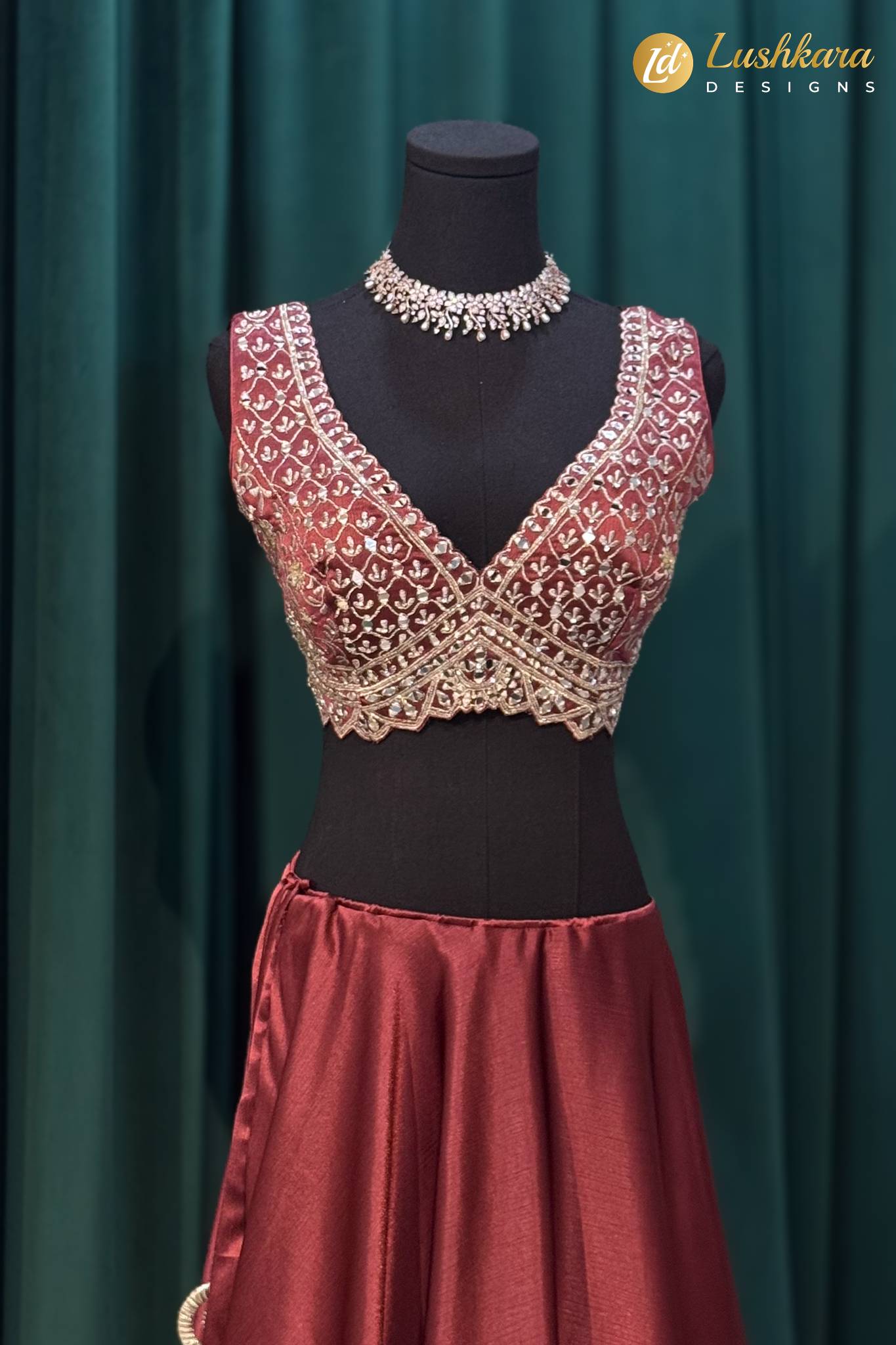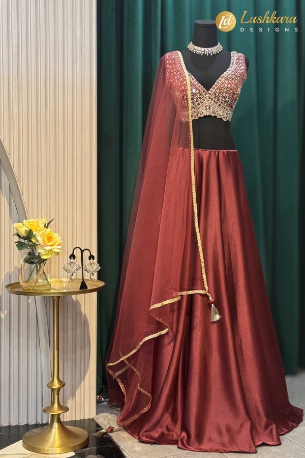 Lushkara Wine Embroidered Lehenga Set, with premium fabric and perfect for festive celebrations such as wedding, party, and cultural occasions.