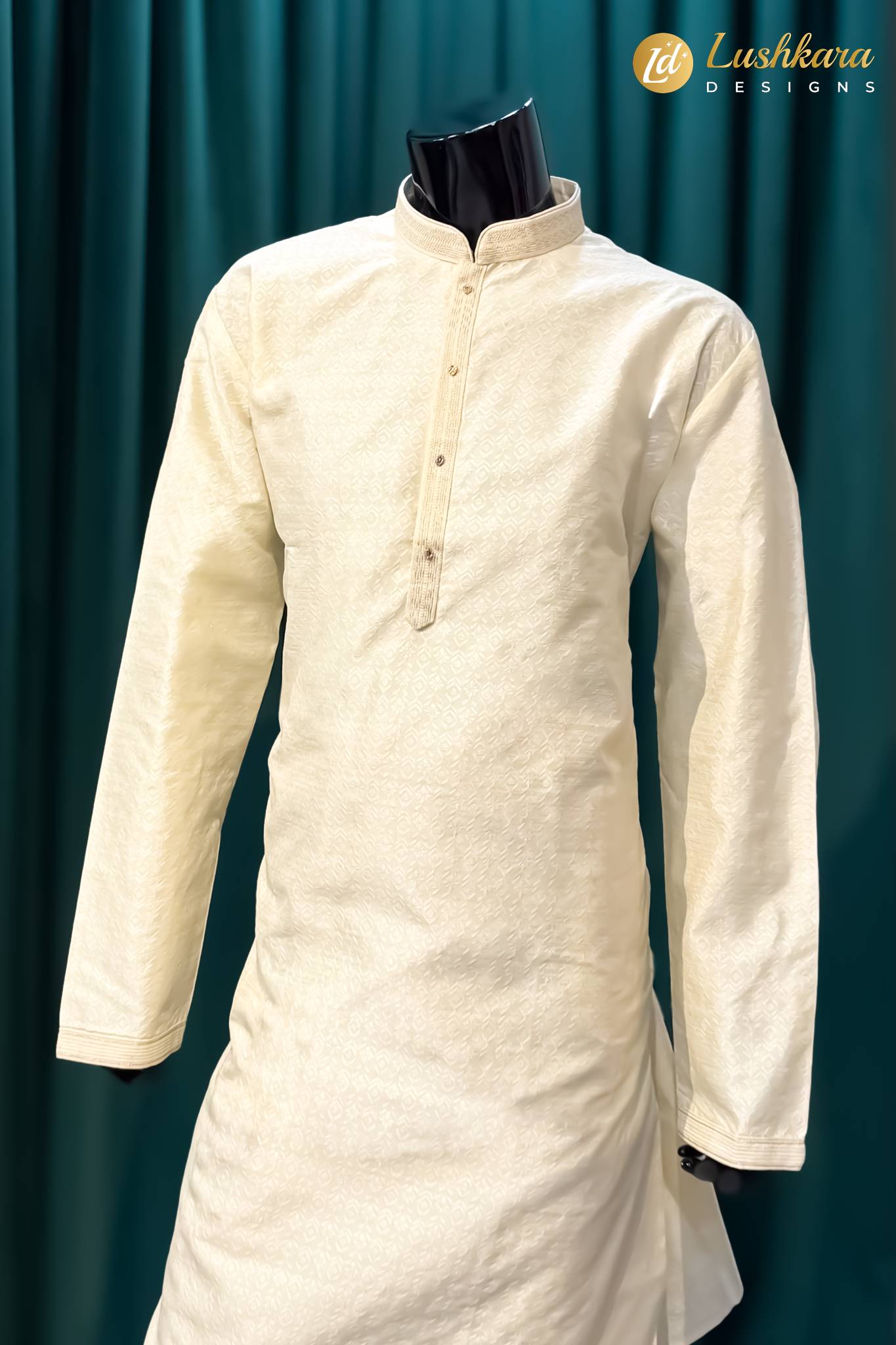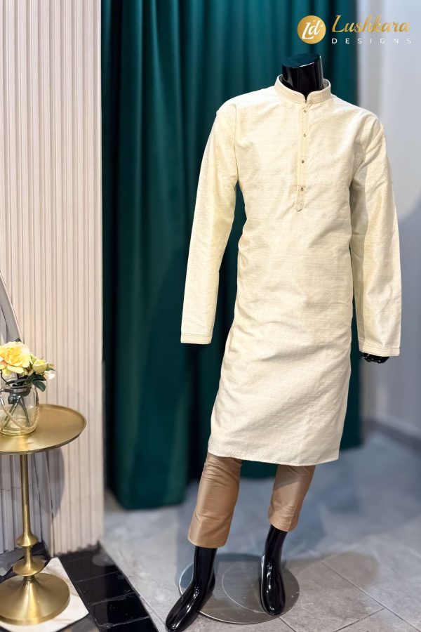 Work: All-over woven texture with minimal detailing and mandarin collar