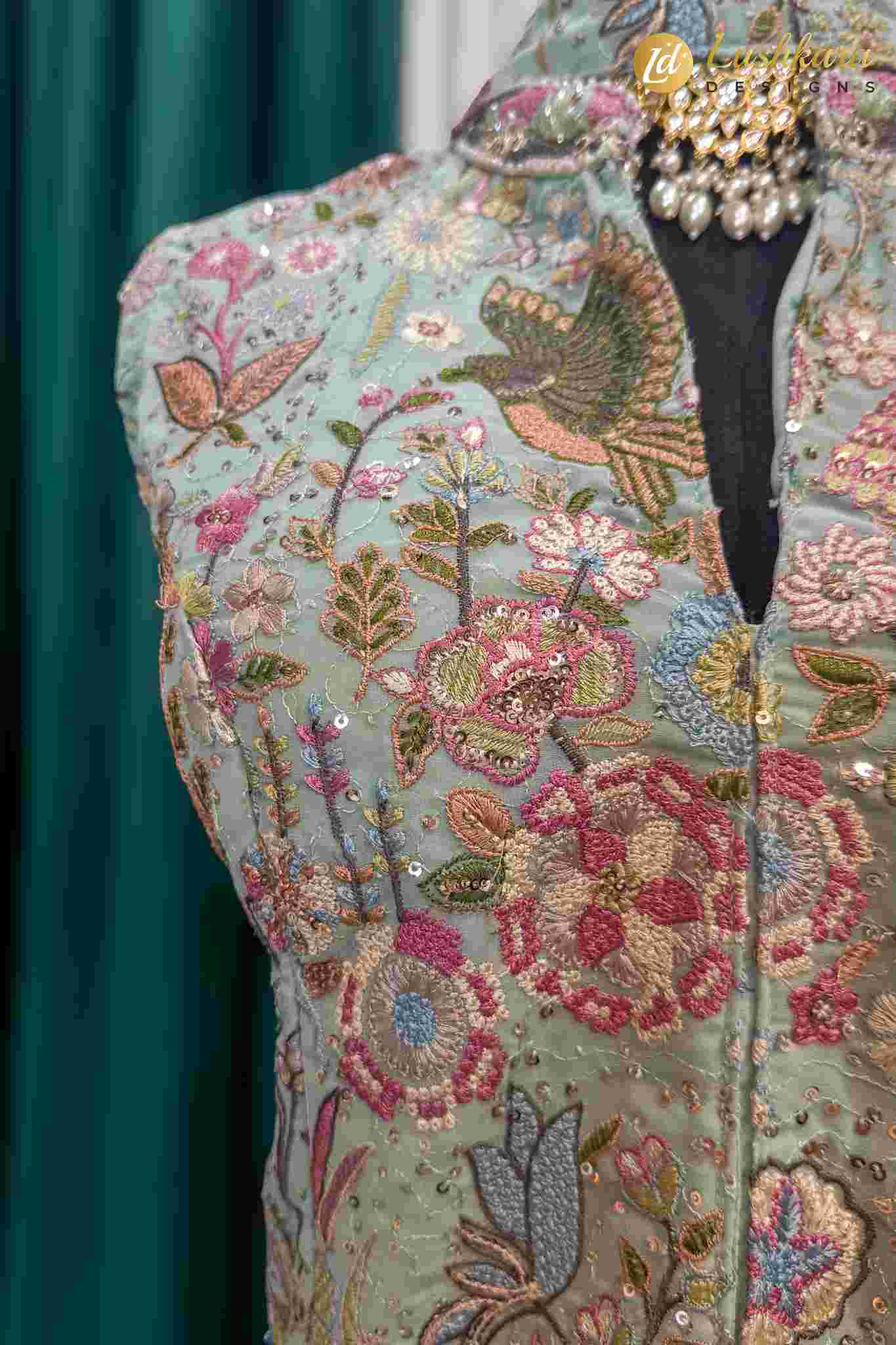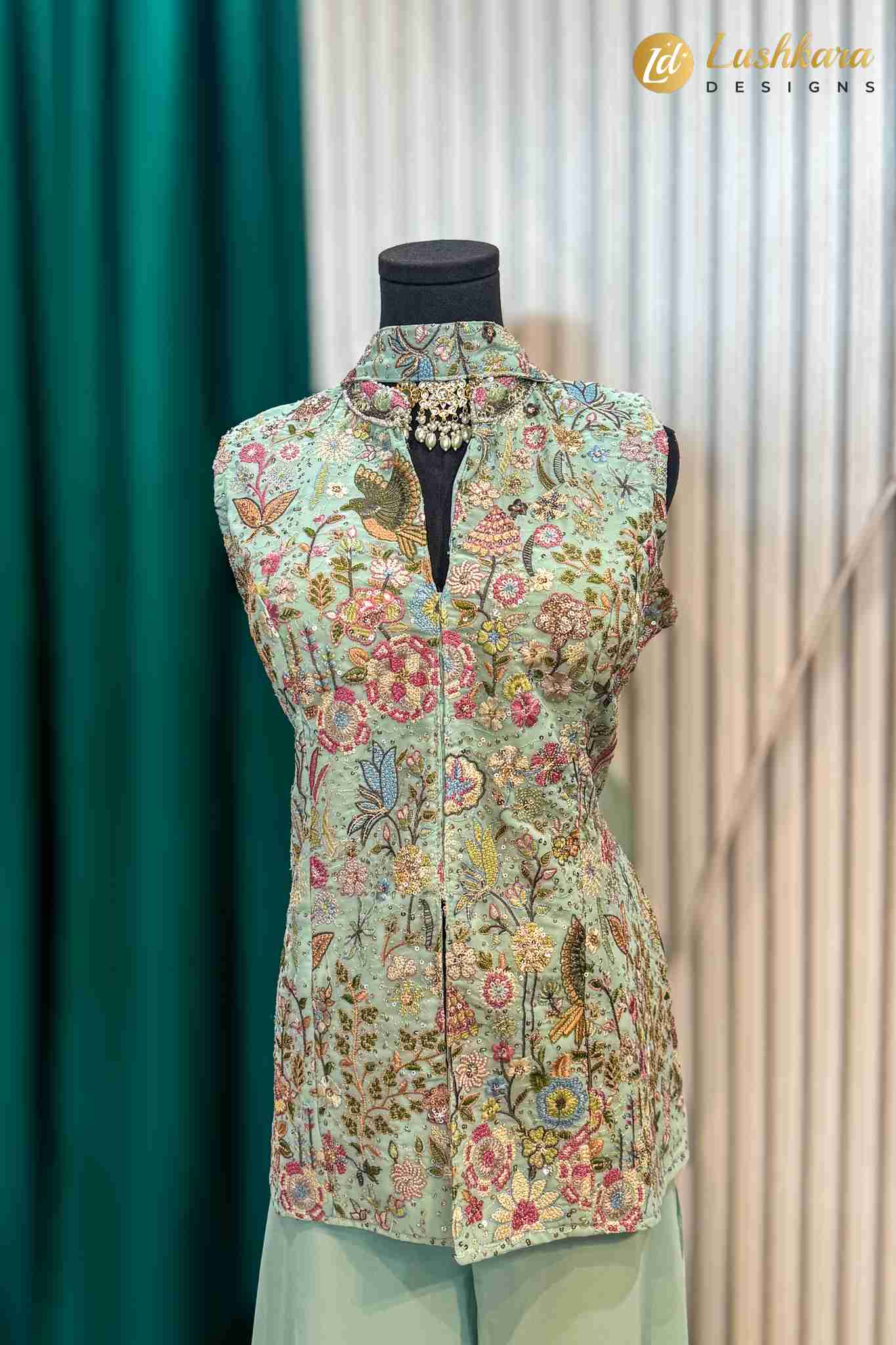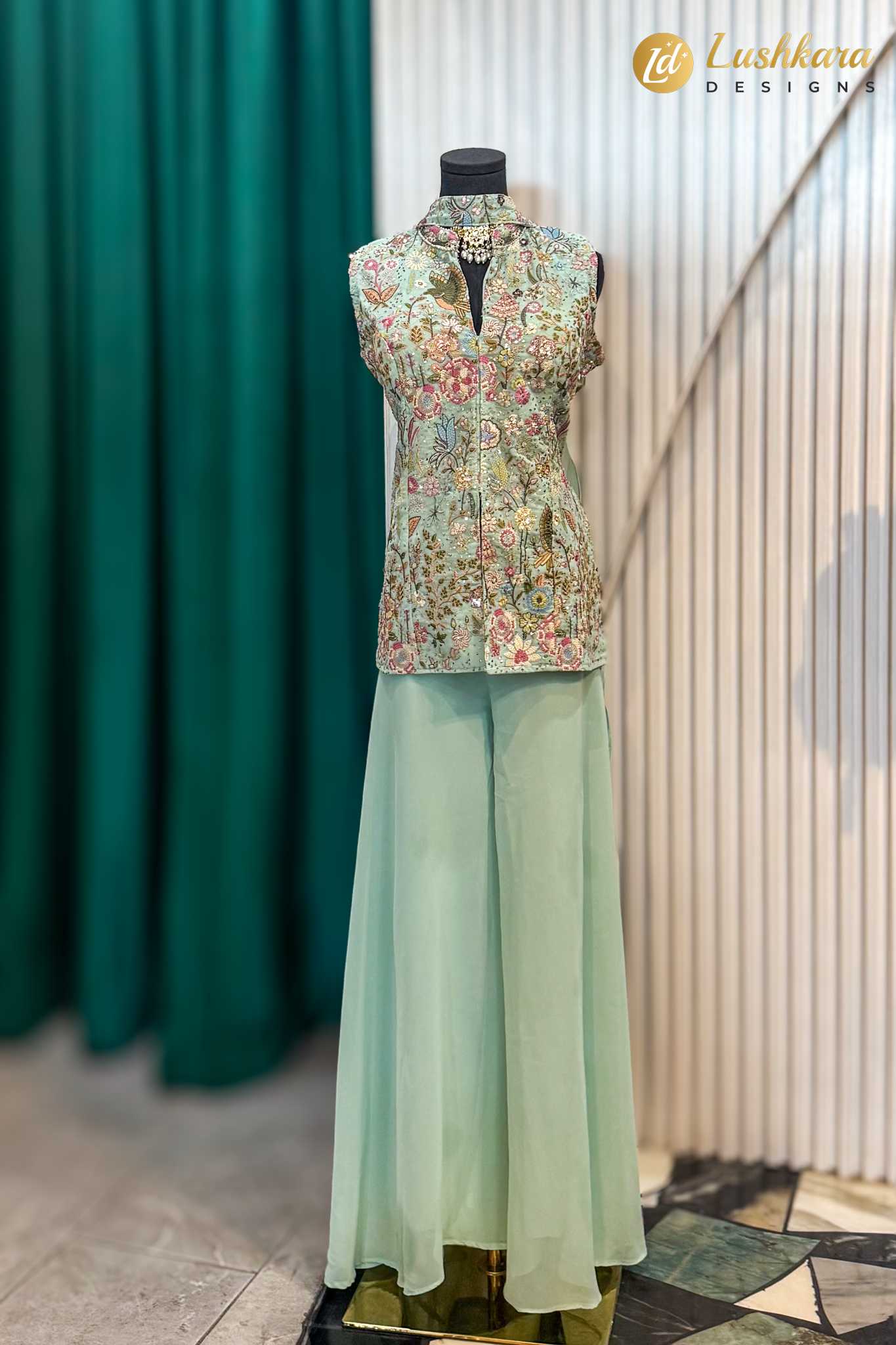 Color: Soft mint green with multicolor floral embroidery Fabric: Lightweight chiffon/georgette palazzo with embroidered silk-blend jacket Work: Intricate thread, zari, and sequin floral embroidery on sleeveless jacket Dupatta: Not included Occasion: Festive wear, mehendi, daytime events, fusion party wear