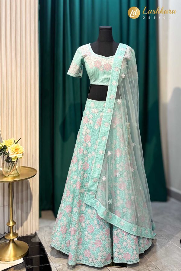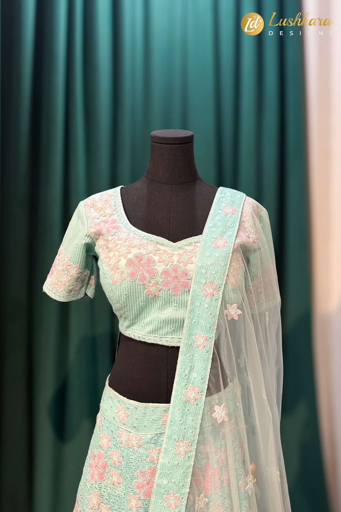 Fabric: Embroidered lehenga skirt with matching blouse and sheer net dupatta