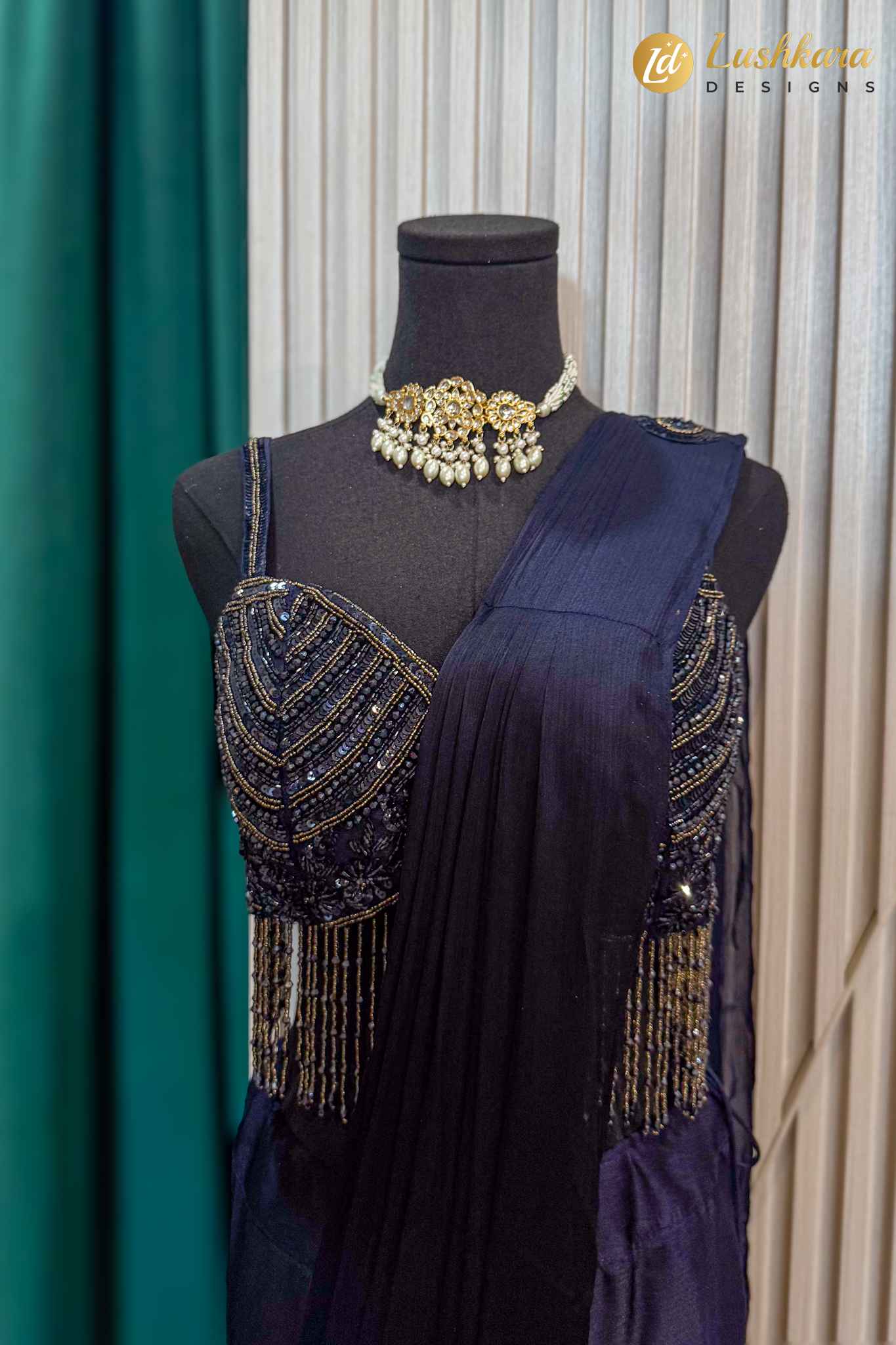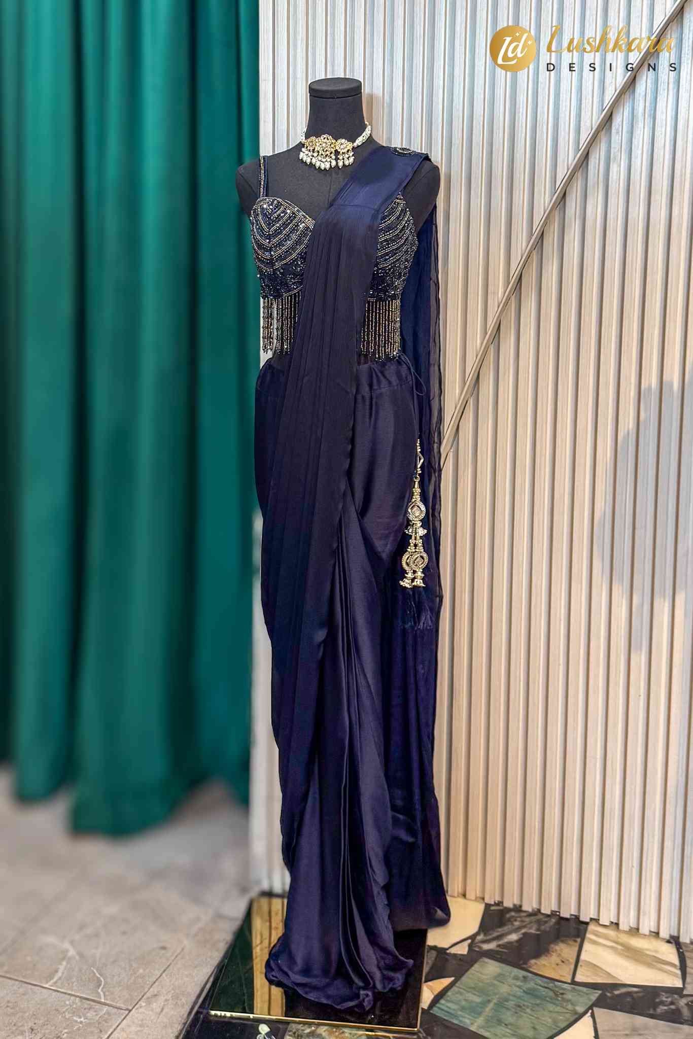 Color: Deep navy blue with gold and metallic embellishments Fabric: Soft satin/crepe draped saree with structured blouse Work: Heavy beadwork, sequins, and fringe detailing on blouse Blouse: Structured blouse with intricate embellishments and statement design Saree: Pre-draped style for modern, effortless wear Dupatta: Not included Occasion: Cocktail wear, reception, evening parties, formal events