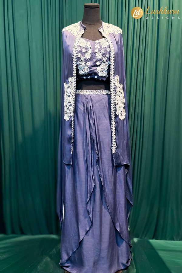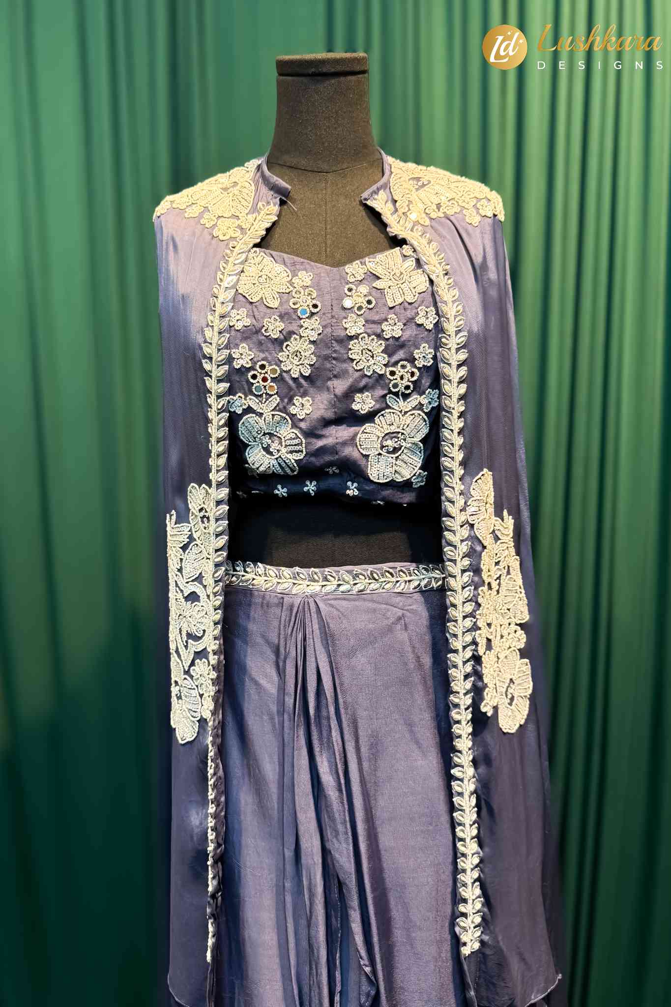 Fabric: Soft silk-blend drape skirt & cape with embroidered detailing