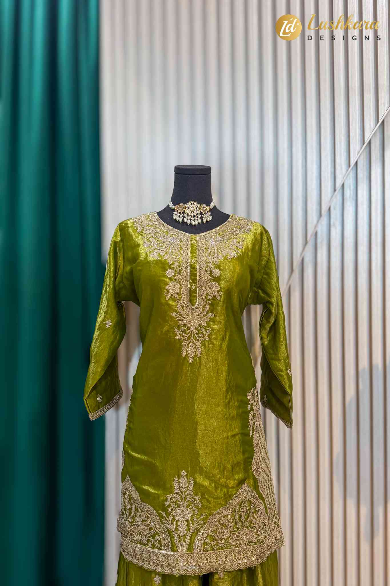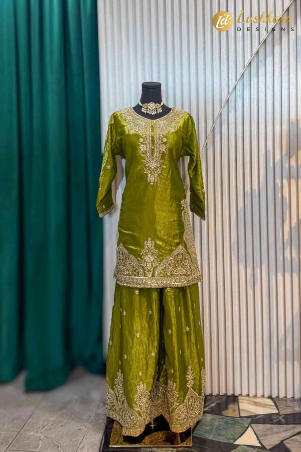 Color: Rich olive green with gold embroidery Fabric: Silk-blend kurta with flowy sharara pants Work: Intricate zari and thread embroidery on neckline, hem, and sharara borders Dupatta: Matching dupatta included Occasion: Wedding wear, festive events, mehendi, sangeet, traditional celebrations