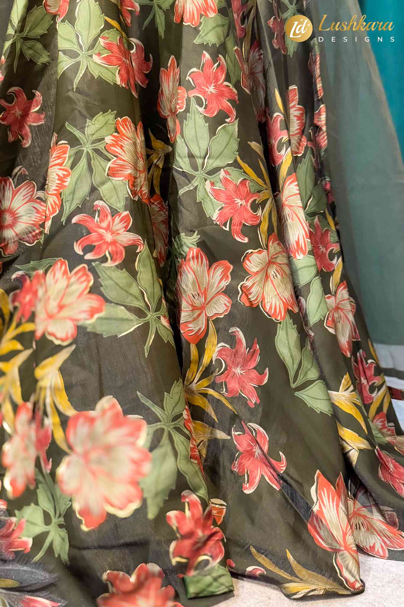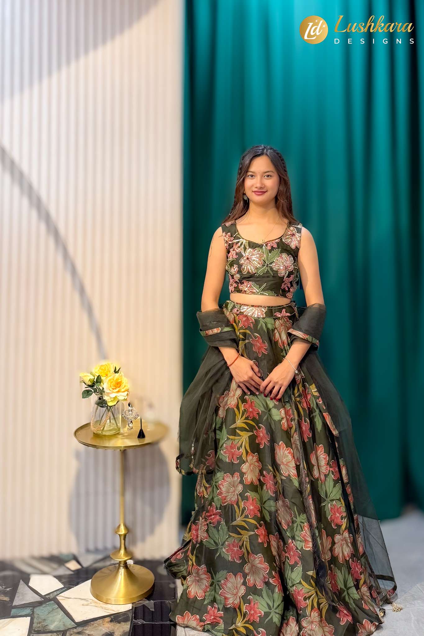 Lushkara Olive Green Floral Printed Lehenga Set, featuring a matching sleeveless blouse, a flowy printed lehenga skirt, and a soft sheer dupatta.