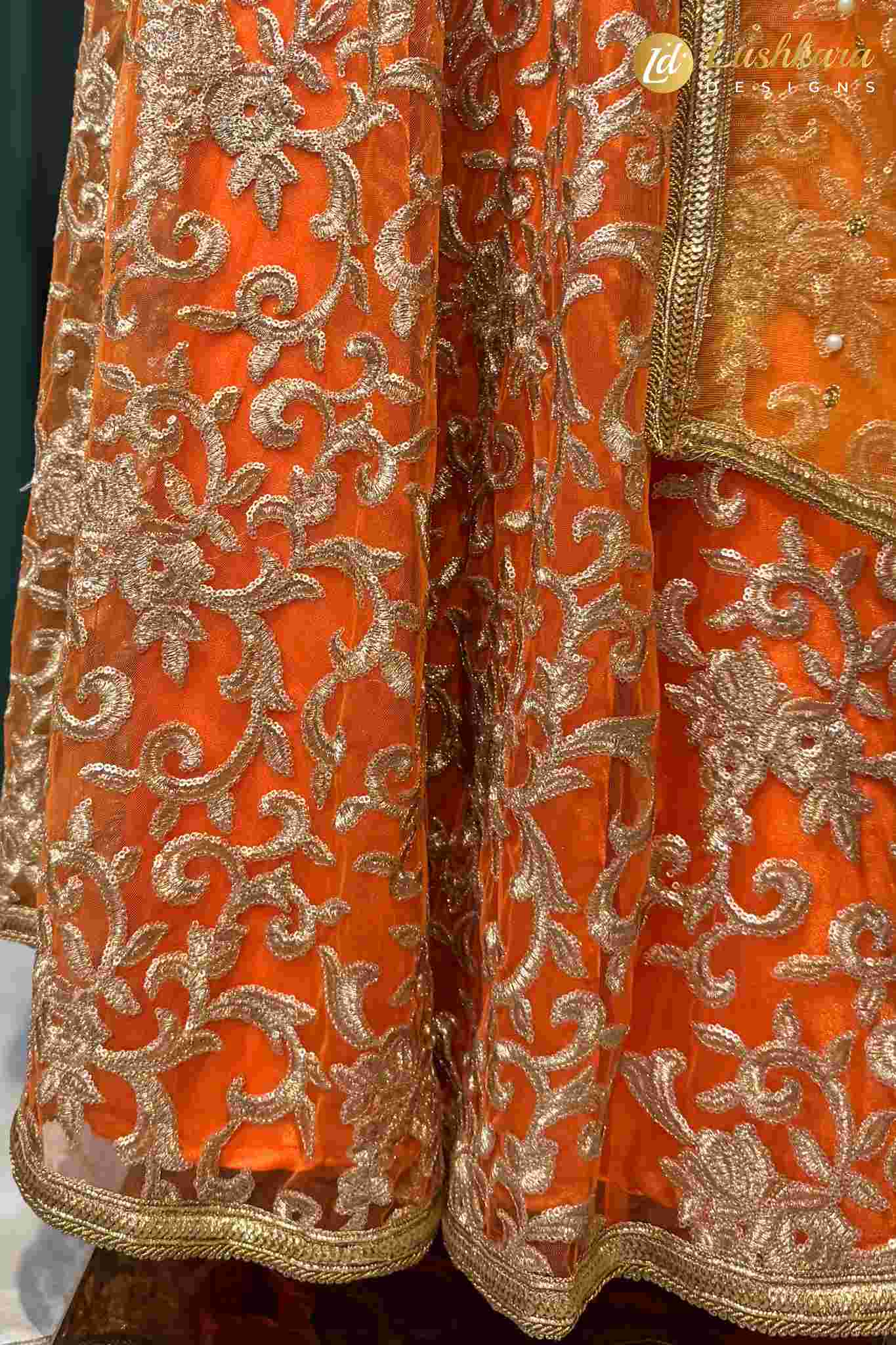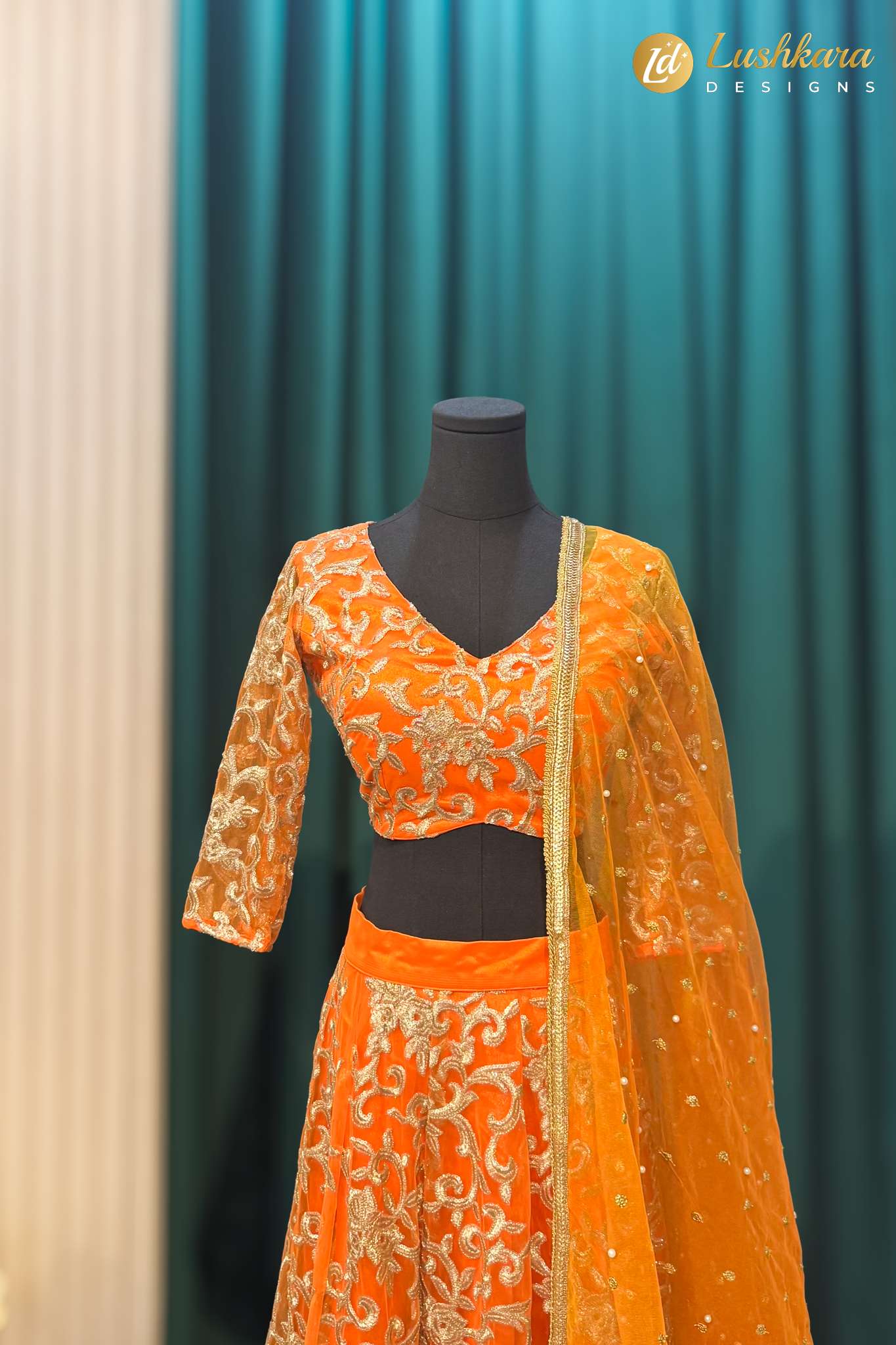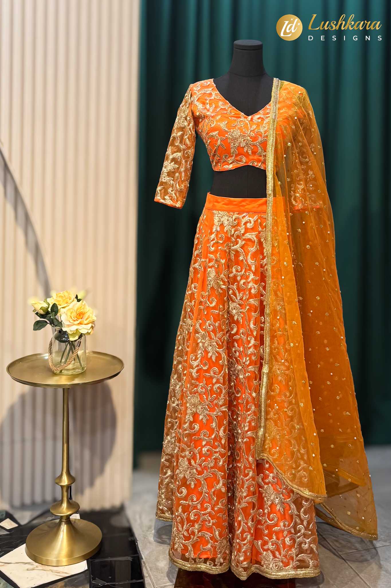 Lushkara Orange Gold Embroidered Lehenga Set, featuring rich gold threadwork, a beautifully crafted blouse, and a sheer net dupatta with elegant border detailing.