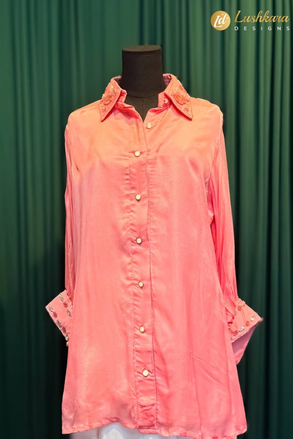 Work: Hand-embellished collar and cuff detailing with pearl/button accents