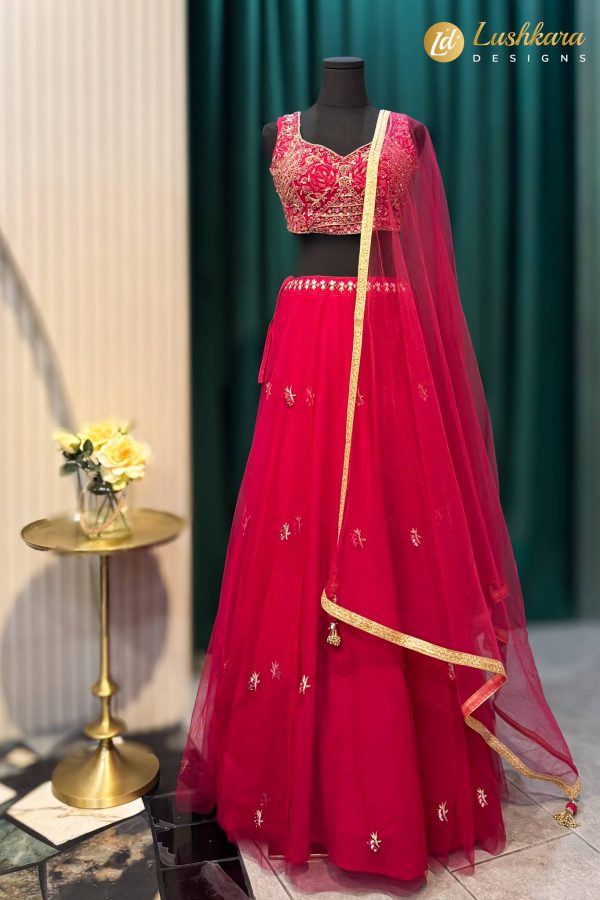 Fabric: Embroidered silk-blend lehenga, matching full-sleeve blouse, and soft net dupatta