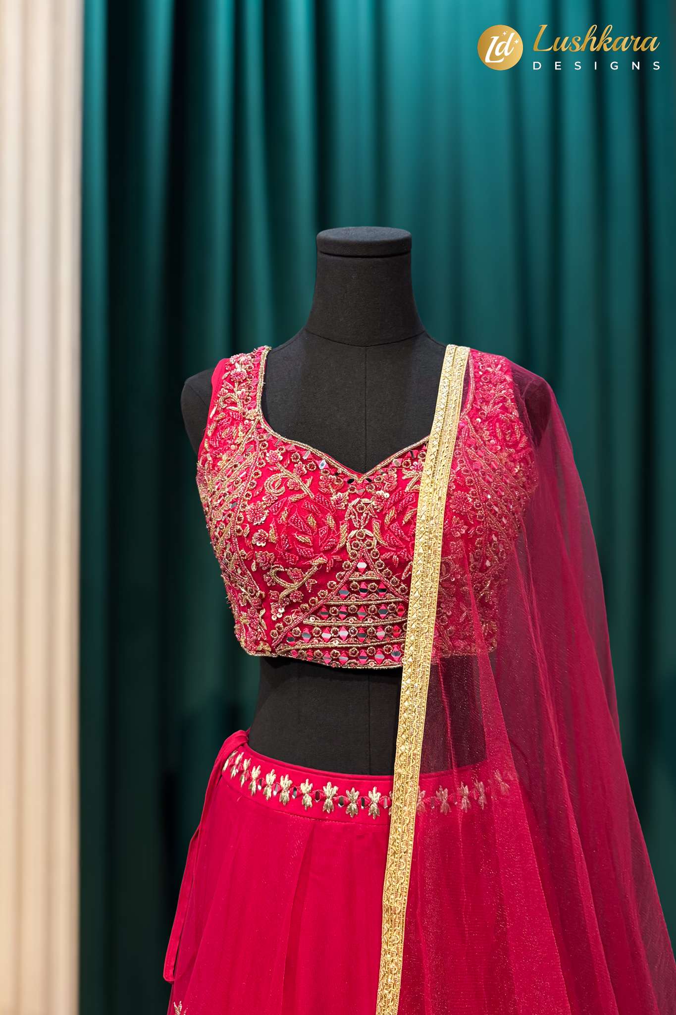 Dupatta: Included – Dark Pink net dupatta with embroidered border and latkan detailing