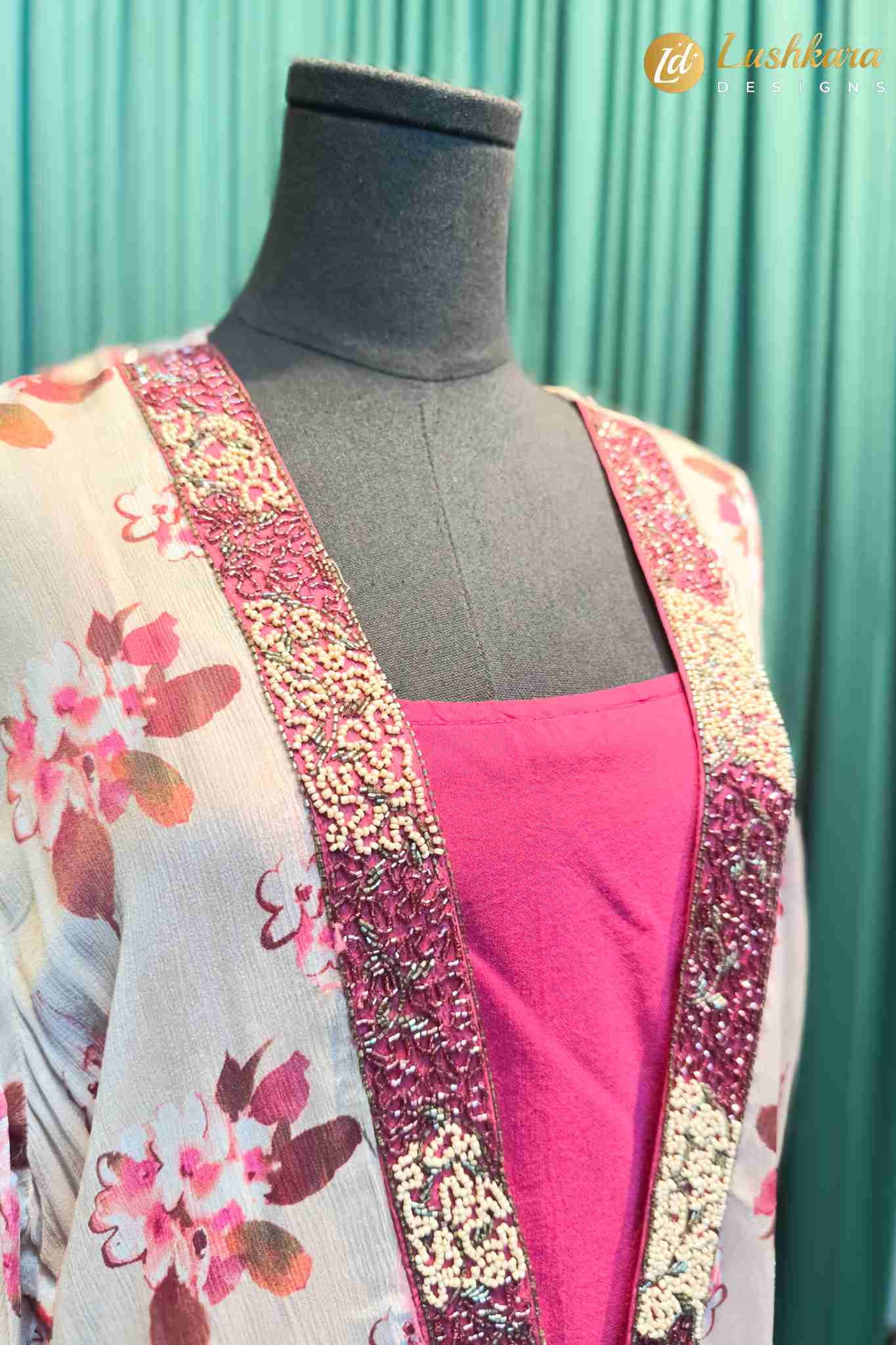Color: Pink base with multicolor floral print