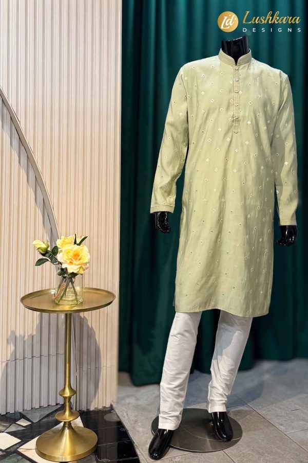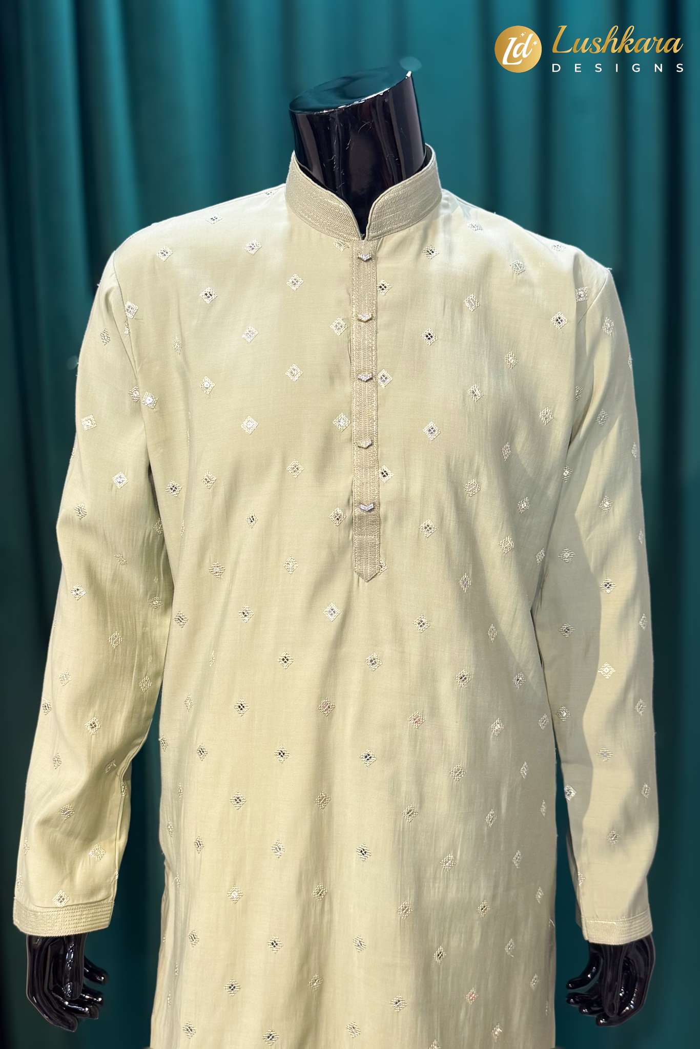 Work: Minimal all-over buti embroidery with neat mandarin collar and placket detailing