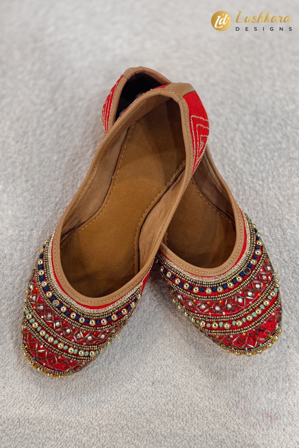 Lushkara Red Bridal Stone & Mirror Work Jutti, Perfect for parties, festive nights, and statement ethnic styling.