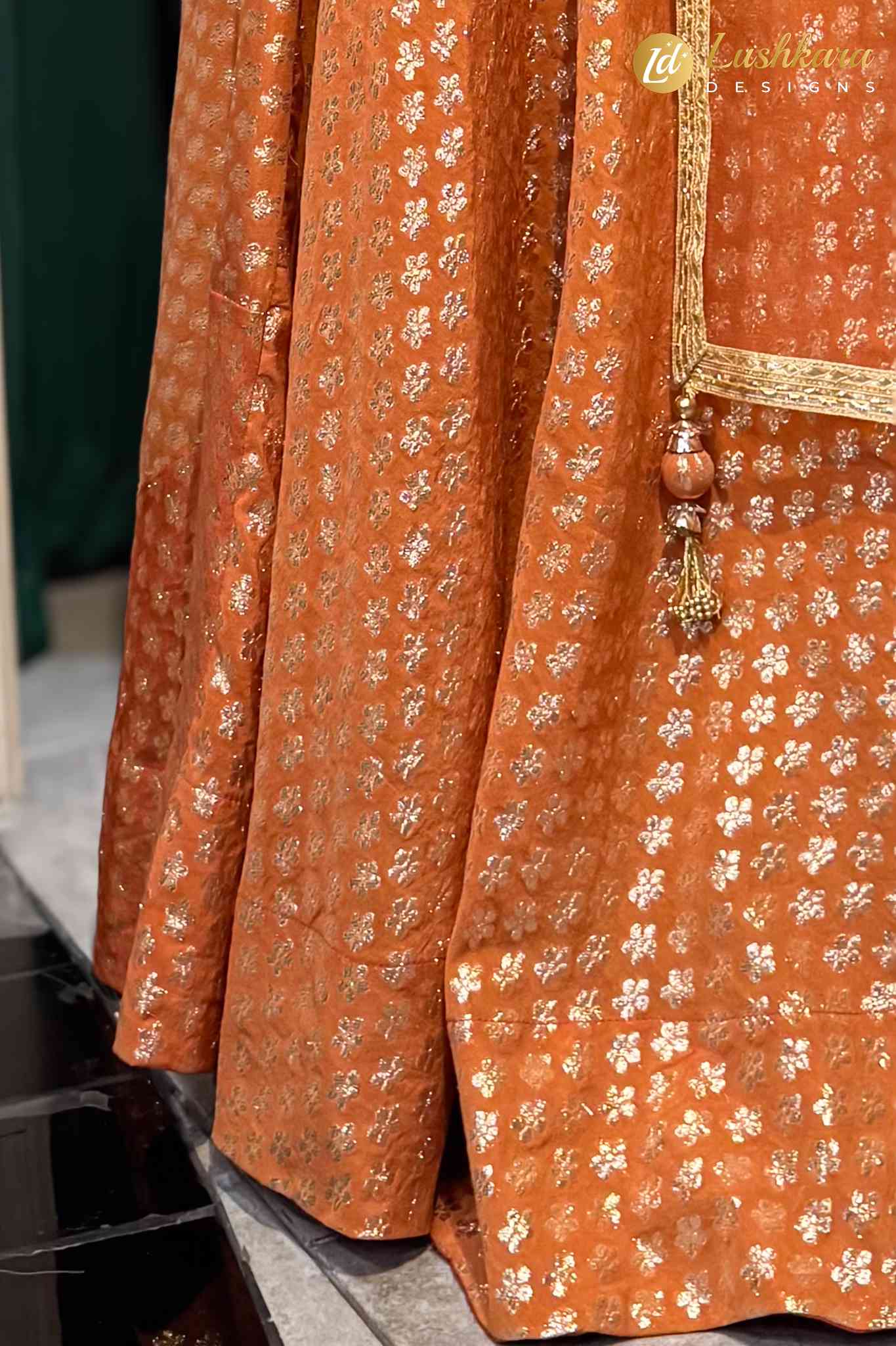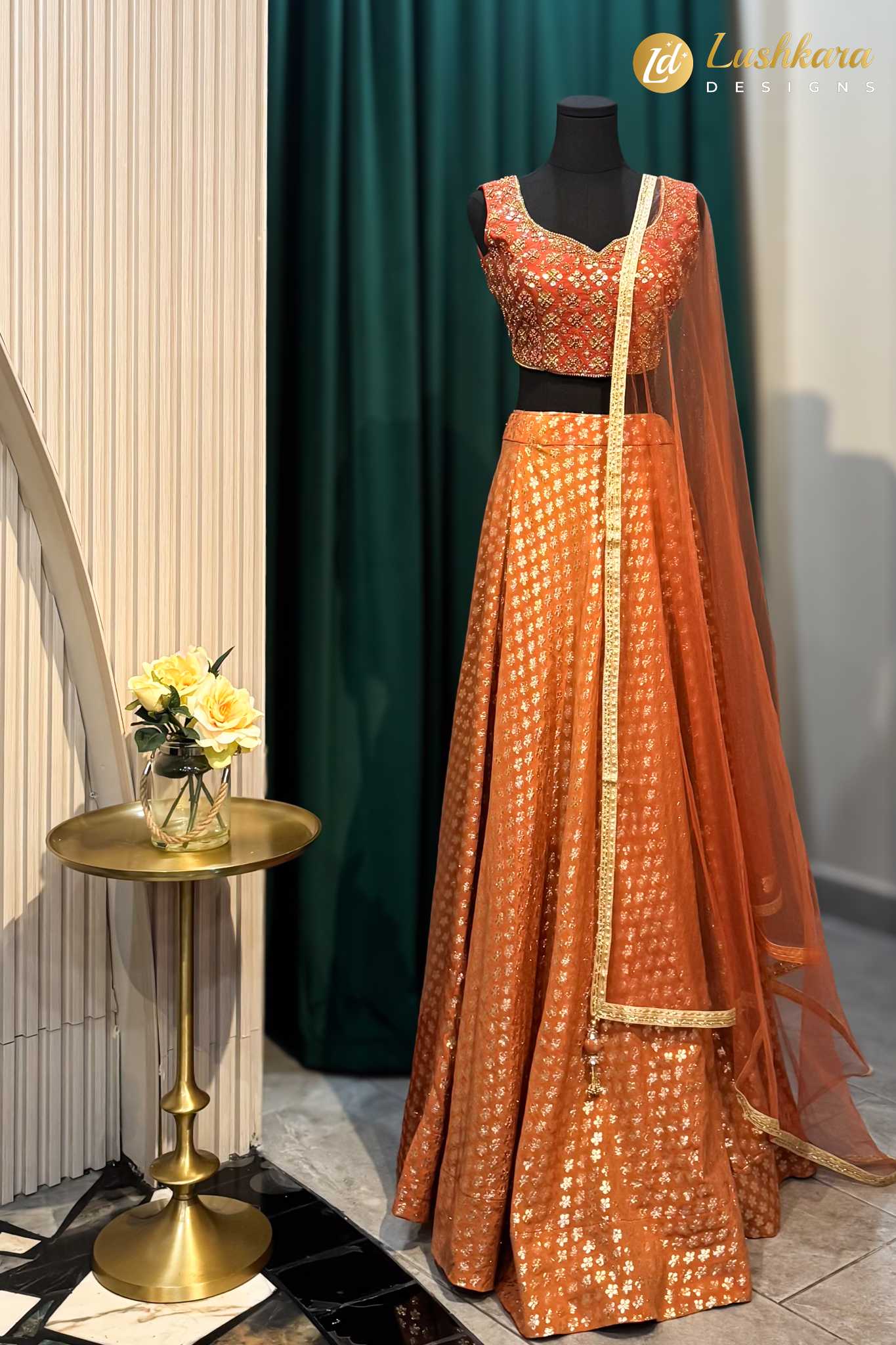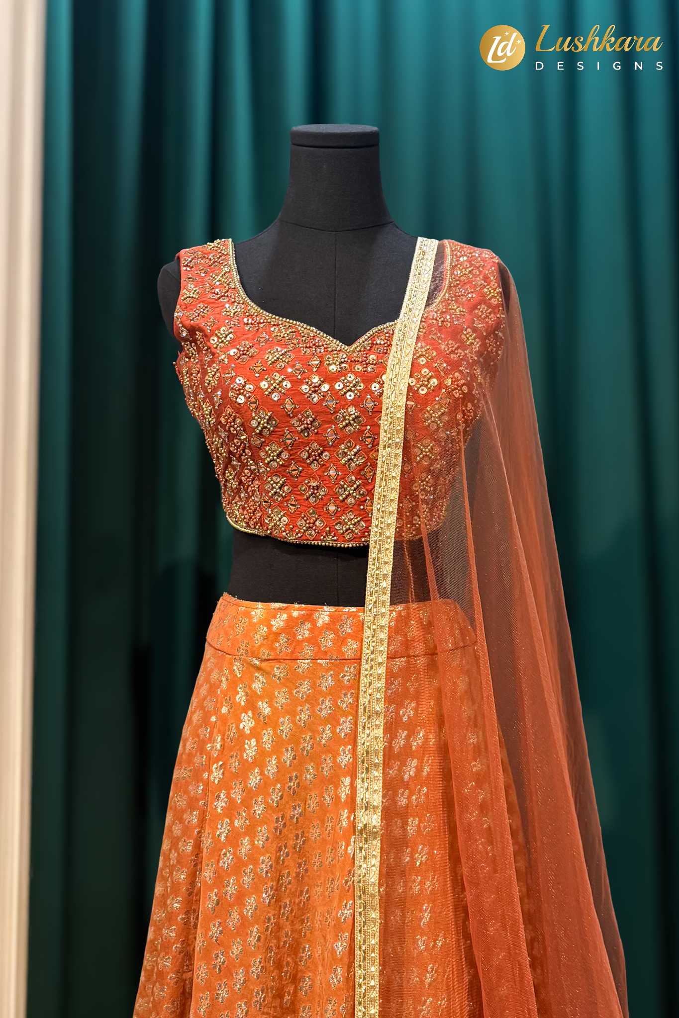 Dupatta: Included โ rust orange net dupatta with gold border and tassel (latkan) detailing