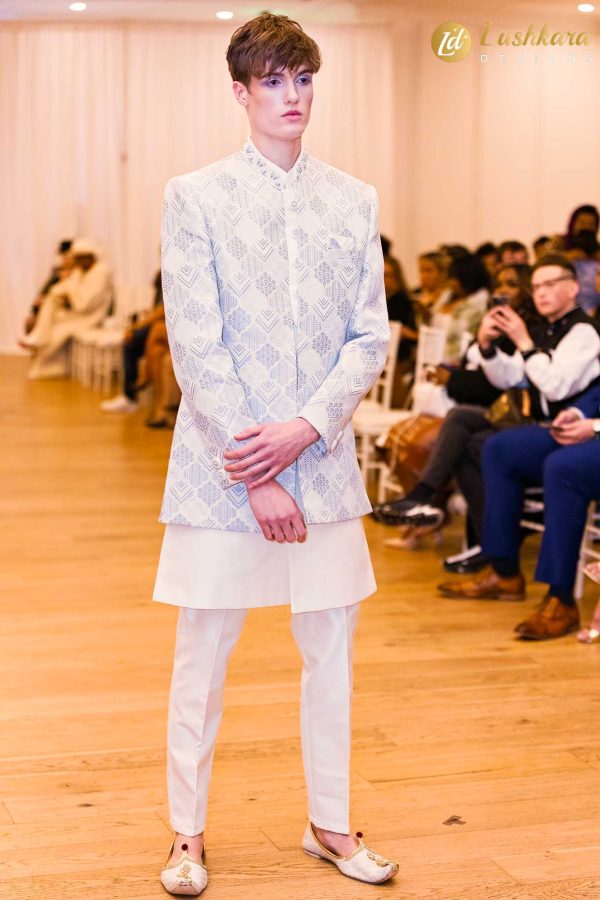 Lushkara White Embroidered Mens Sherwani Set, perfect for weddings, festive nights, and cultural events.
