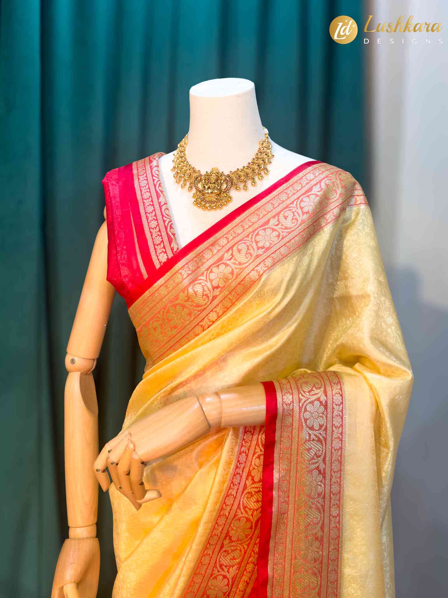 Lushkara Yellow and Red Banarasi Silk Saree- Perfect for weddings, receptions, and festive events.